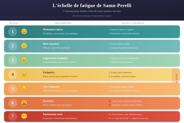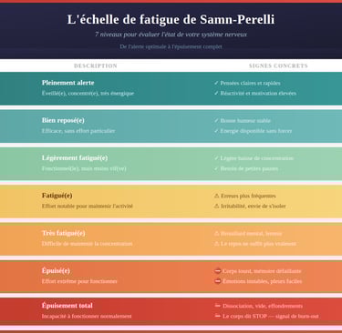 L'échelle de fatigue de Samn-Perelli permet d'évaluer rapidement la fatigue subjective sur sept niveaux, de l'épuisement à l'état d'alerte optimal. Elle est utilisée dans certains contextes professionnels et sportifs pour suivre l'évolution de la fatigue.