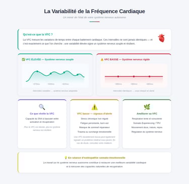 La variabilité de la fréquence cardiaque (VFC) est un indicateur de l'équilibre du système nerveux autonome. Elle reflète la capacité du système nerveux à s'adapter aux contraintes et à revenir vers un état de récupération après une activation. Une variabilité faible peut indiquer un organisme qui reste durablement en état de mobilisation physiologique.